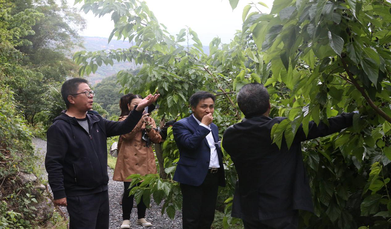 在果园林荫小道,苗主席和王院长兴致勃勃地体验了桑葚采摘,在细细品尝后对香甜的水果赞不绝口。